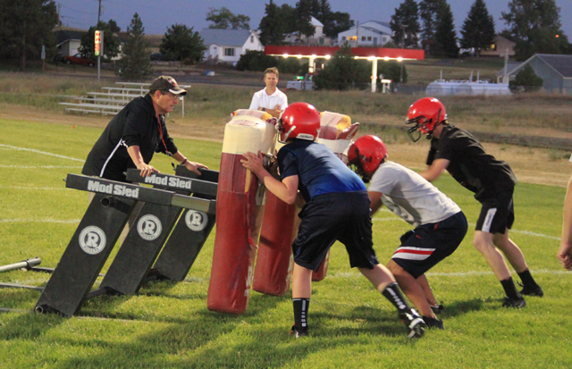 Linemen hit the blocking sled Monday during Prairie’s first official football practice. Line coach Ron Sigler provided encouragement. PIRATES BOYS FOOTBALL SCHEDULE FOR 2013 13-Genesee*, here 20-Kendrick, here, Homecoming 27-Lapwai*, there 11-Kamiah*, there 18-Lakeside, there 25-Troy*, there 8-Kibbie Dome, TBA 15-Kibbie Dome, TBA 22or 23-Championship, TBA *League game If you’re wondering about the 5 straight road games on the football schedule, the CV game would’ve been a home game this year but it will be there since last year’s game was moved to Cottonwood due to heavy smoke in the Kooskia area. |