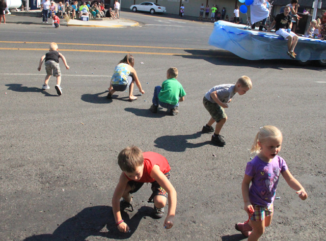 Youngsters scramble after candy tossed out by nearly every parade entrant. |