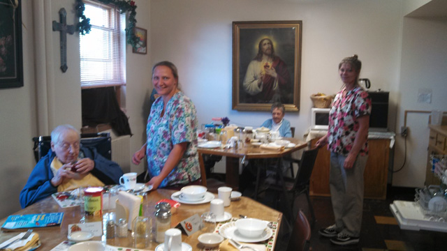 Sister Catherine Manderfeld and Sister Carolyn Miguel receive care from Rita McWilliams and Sheila Smith. |
