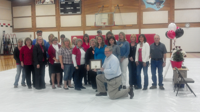 Education and kneeling in front, presented Prairie Elementary staff, students,