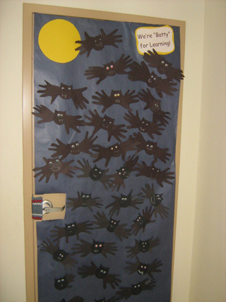 door with happy bats, lower photo. The 5th and 6th grade art classes decorated