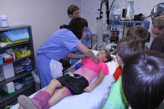 Surgery nurses showing how they prep a patient for surgery. Rachael Gimmeson is the 5th grader being hooked up. Photos provided by Colleen Sonnen. |