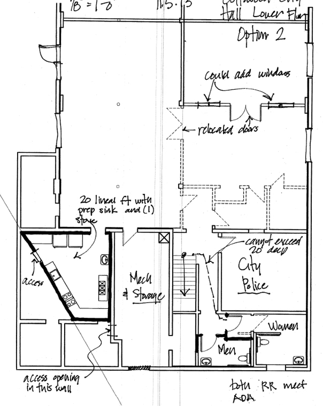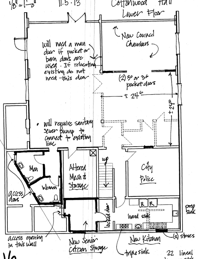 The City of Cottonwood is currently looking to improve the Cottonwood Community hall basement. They would like to increase the main room by removing some storage rooms, hallway area and dividing the city council chamber room in half. They would also add a second bathroom so we would have a men’s and women’s bathroom. They also want to increase the size of the kitchen and change the layout. If they increase the size of the main room people could rent the basement for the wedding ceremony and rent the upstairs for the reception rather than having two separate locations for the wedding. Another thought was that some of the birthday gatherings are smaller in size and the upstairs is just too big so the basement would be just perfect. Someone else said it would be the perfect place for showers wedding or baby. Other people have suggested that if it were larger and had a nice kitchen that a funeral dinner could be held downstairs on the days that the upstairs is not available. Training could be conducted in the basement rather than the upstairs. Since it is the season maybe you are looking for a place to hold your Christmas party the basement is a great place for a family to gather when it is too large for your house. The City is asking for suggestions from the community. The diagrams on this page shows the options take a look at these options and call Shelli Schumacher 208-962-3138 or Carol Altman 208-962-3231 with your thoughts and suggestions.