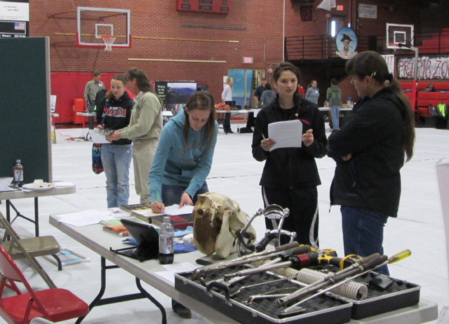 Prairie Junior/Senior High hosted a Science Career Fair on December 17th for the 7th-12th grade science classes. Students could choose from 20 different presenters to visit with about their science-related careers. This activity was organized by science teacher, Liz McLeod, and GEAR UP Site coordinator, Loretta Poxleitner, to help the kids see all the different career options that are related to science. A big thank you to the following individuals for taking the time to attend this event and help the kids explore science-based careers: Helen Rowland (Veterinarian), Lynn Danly (BLM/Natural Resource Specialist), Brad Schaff (Dentist), Jan Jungert (Nurse Practitioner), Colleen Bennett (Hospital Laboratory Manager), Steve Wilson (Radiology Technician), Kathy Seubert (Registered Nurse), Kyle Westhoff (Physical Therapist), Shannon Fuchs and Brett Madron (Idaho Forest Group Engineers), Mike Kennedy and Josh Kaschmitter (Primeland, Agronomy), Rhonda Wemhoff (Architect), Bill Seybold and Kyle Christopher (Fish and Game, Wildlife Biologist and Conservation Officer), and five representatives of the Forest Service – David Green (GIS Specialist), Anne Connor (Hydrologist), Amy Larson (Forester) Josh Lattin (Trail Specialist) and Tom McLeod (Fire Fighter).