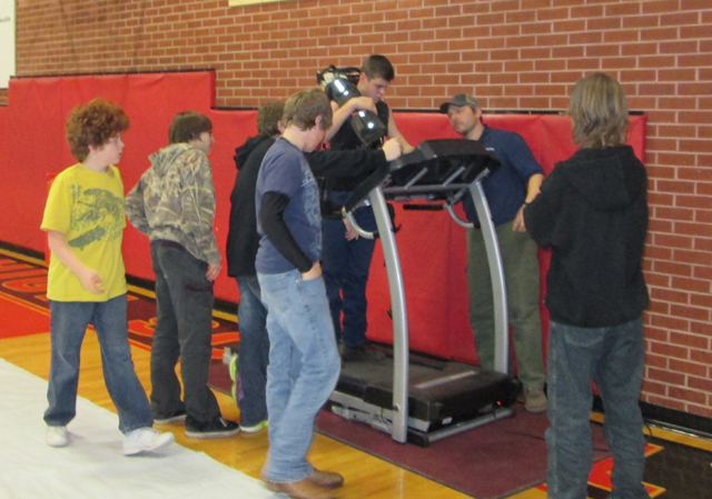 Wildlands Fire Fighter, Tom McLeod of the Forest Service, gave students the opportunity to try on his fire pack, sling his chainsaw over their shoulder and "take a walk" on the treadmill. Here, Jayce Huling gives it a try with his classmates looking on. |