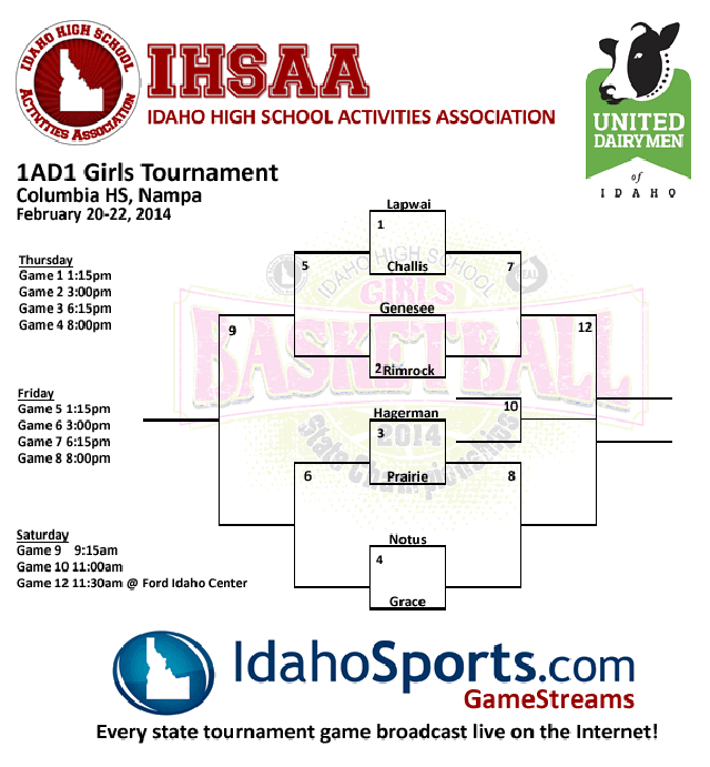 The Prairie Lady Pirates look to have a tough draw in the opening round of the State Tournament, which gets underway this Thursday, Feb. 20 at Columbia High School in Nampa. Prairie gets to play Hagerman, which is the only unbeaten team in the 1-A, Division 1 Tournament. According to Prairie coach Lori Mader, Hagerman has a 6’4” girl who is their leader. She’s a big girl apparently but is athletic enough to step out and hit an outside shot on occasion. Looking at their scores during the season they tend to score in the 40’s and 50’s with a season high score of 58 points. In District they beat Challis 54-49 and Grace 52-49, the two other teams from Districts 4-5-6 to advance to state. Grace and Challis also made it to state last year while Hagerman did not. Challis gets the honor of playing Lapwai in the opening round for the second straight year. They play at 1:15 p.m. (all times MST). Genesee plays Rimrock at 3 p.m. Those winners play at 6:15 p.m. Friday while the losers play at 1:15 p.m. In the other half of Prairie’s bracket Grace will play Notus. Prairie would play at 8 p.m. Friday if they win against the Grace-Notus winner. If they lose they would play at 3:00 p.m. Friday. The Championship game is 11:30 a.m. Saturday at the Idaho Center while the consolation game is at 9 a.m. and the 3rd place game is at 11 a.m. The latter two games will be at Columbia High School.