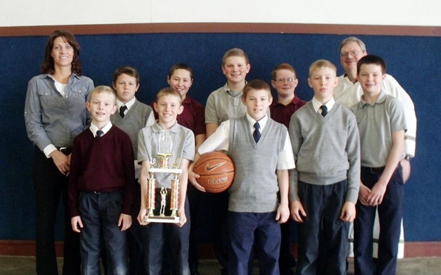 Summit Academy boys' Hallissey team has won the Sportsmanship Trophy for the 2nd year in a row! Between the boys and the girls Summit has earned this award a total of 7 times over the years. Pictured: back row l-r: Coach Mrs. Krogh, Luke Schwartz, David Wassmuth, Jake Stubbers, Nicholas Beckman, and Fr. Paul front row l-r: Lane Wassmuth, Luke Wassmuth, Michael Schwartz, Justin Wassmuth, and Dylan Krogh. Photo provided by Summit Academy. SUMMIT BOYS BASKETBALL 2013-2014 December 5-at Kendrick, 7:30 p.m.*, won 47-34 7-vs. Deary at Highland, 2 p.m.*, lost 26-35 16-vs. Highland at Highland, 7:30 p.m.*, won 70-51 21-at Logos, 2 p.m.*, won 62-45 7-vs. Nezperce at Prairie Elem. 6 p.m.*, lost 42-47 9-vs. Kendrick at Prairie Elem. 7:30 p.m.*, won 63-38 14-at C.V., 7:30 p.m., won 46-40 18-vs. Logos at Highland, 2 p.m.*, won 53-48 21-at Timberline, 6:30 p.m.*, won 68-53 23-at Highland, 7:30 p.m.*, won 71-26 24-at Deary, 7:30 p.m.*, lost43-44 28-at Nezperce, 6 p.m.*, won 53-52 30-home vs. Meadows Valley, 6:30 p.m., won 65-23 12-at Lapwai, 6 p.m. (rescheduled from Feb. 10 due to girls district), lost 54-60 21, 25, 26-District at LCSC-beat Nezperce 62-44; lost to Kendrick 53-61 (details next week); beat Deary 47-43 (details next week) March 1-vs. Kootenai at St. Maries, 4:30 p.m., if they win they advance to state where they would play at 1:15 p.m. MST at Caldwell High against Rockland. *indicates league game |