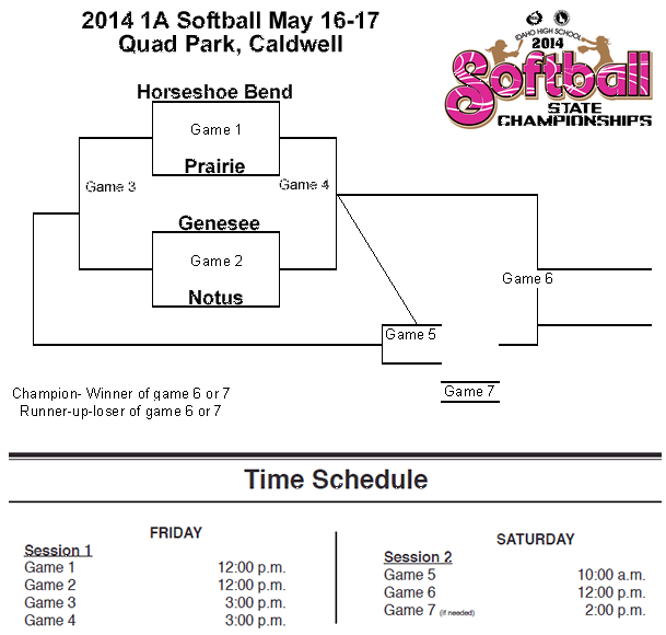 SCHEDULE FOR 2013-14Prairie Softball 2014 March 15—Kellogg (2) @ Lewiston Airport #2, 12:00, won 11-1 and 20-2 18—vs. Highland @Culdesac, 4:30, won 21-1 21—McCall, here (2) 4:00, won 17-6 22—Asotin Tournament: Kendrick, 1:15, won 10-7; Asotin, 3:30, won 13-7 25—Troy, here, 5:00, won 11-6 11 & 12—Glenn’s Ferry Tournament: Friday: beat North Fremont 23-0; beat Soda Springs 11-4; lost to Malad 0-5; beat West Side 9-4 15—vs Genesee at Lewiston, lost 4-10 21—CV, here, 4:00, won 12-0 22—Highland, here, 4:30, postponed due to rain to May 6 24—Troy, there, 5:00, POSTPONED TO MAY 3 29—Genesee, here, 5:00, lost 0-5 3—Troy, there, 11:00 a.m. + JV game, lost 10-11 5—Colton, there, 5:00, lost 2-11 6—Highland, here, 4:30 p.m., won 19-4 8 & 9—Districts @Lewiston, beat Troy 10-3, lost to Genesee 0-14, beat Troy 10-0, 2nd at District 16 & 17—State @Caldwell, vs. Horseshoe Bend, noon MDT at Caldwell May 16 |