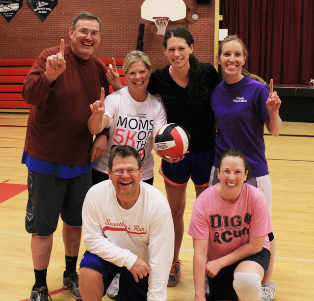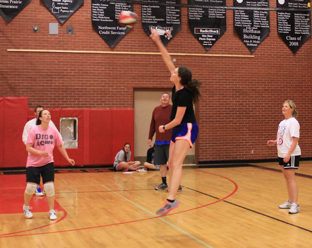 Jamie Scheffler-Physical Therapist for St. Mary’s Hospital goes up for the ball as the team looks on. Photo provided by Cheri Holthaus. |