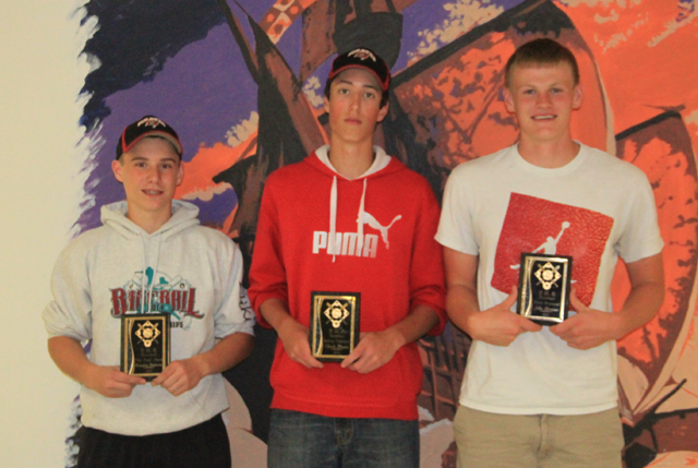 Baseball awards were given out last Thursday. Plaque winners from left are Brandon Anderson, Pete Rose award (for his hustle and versatility); Clark Bruno, batting champion, and Jake Bruner, Most Improved.