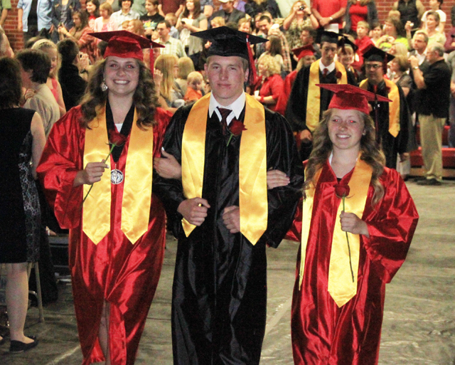 The valedictorians, Beka Bruner, Drew Cochran and Nicole Wemhoff, lead the procession.
