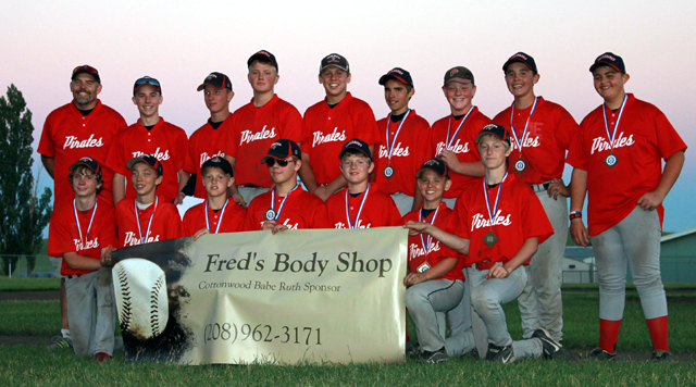 After a season of 11 wins and only 4 losses Prairie Babe Ruth took 2nd place in the end of the season tournament held in Cottonwood last week. Prairie defeated Grangeville and Salmon River but couldn't come up with the win to beat C.V. in the final game, losing to them 14 to 11. Awards were handed out to Brandon Anderson for best on base percentage of 92.7%. Brandon Higgins received the sportsmanship award and Devin Bruegeman received the batting champion award with a batting average of .774. Team from left to right, top row: Asst.Coach Neil Bruegeman, Brandon Anderson, Devin Bruegeman, Spencer Schumacher, Ryan Glimp, Tate Berdoy, Derek Arnzen, Jace Perrin, Andrew Kassale Bottom row: Nick Mager, Sean Spencer, Dylan Schumacher, Jon Halligan, Brandon Higgins, Owen Anderson, Tyson Schlader. (Not pictured: Coach Kyle Westhoff, he was at the hospital welcoming his newborn son, Mason. Congrats Kyle and Whitney!) Photo submitted by Kristi Bruegeman.