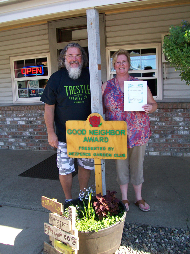 The purpose of the Good Neighbor Award contest is to recognize home and business gardens for the special beauty they add to the community. The winners receive a certificate suitable for framing from the Nezperce Garden Club, signed by the Garden Clubs of Idaho State President and the Nezperce Garden Club President. A sign for either floral or vegetable garden is placed in the winning gardens. On July 10, 2014 Mike and Kim Ingram, owners of Trestle Brewing Company received the Good Neighbor Award for their flowers in front of their place of business at 413 Main Street. Mike has worked hard at maintaining the large hanging baskets and whisky barrels filled with assorted flower in front of Trestles. The Ingram’s have planted a large variety of flowers of every color to brighten up the town. Mike and Kim have done a marvelous job of beautifying Ferdinand. Mike Lauer is the recipient of the Good Neighbor Award for his vegetable garden at 200 First Avenue. Mike’s garden is very well kept and has large beautiful cabbage heads, potatoes, tomatoes, squash, onions, corn, cucumbers, carrots, beets and rhubarb surrounded by cherry trees, currants, and other berries. Mike’s vegetable garden is very well maintained and looks Fantastic. The Nezperce Garden Club would like to thank all nominees for allowing the judges to walk through their yards to look at their gardens. Also we would like to give a special thanks to all three judges, for doing such a wonderful job of picking out our Good Neighbor Award winners this year.