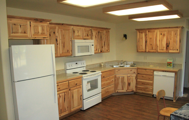 The kitchenette area in the northwest corner apartment. Jack Wimer’s brother Ron, who died recently, built all the cabinets. They are built from hickory and Jack said his brother had a unique way of dealing with the knotholes.