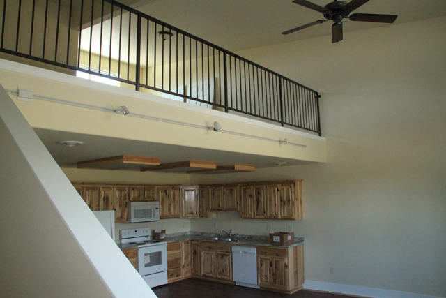 Inside the northeast corner apartment with the kitchenette and the railing for the loft. |