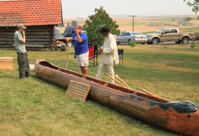 An interested listener learns about the dugout canoe on display at the Raspberry Festival.