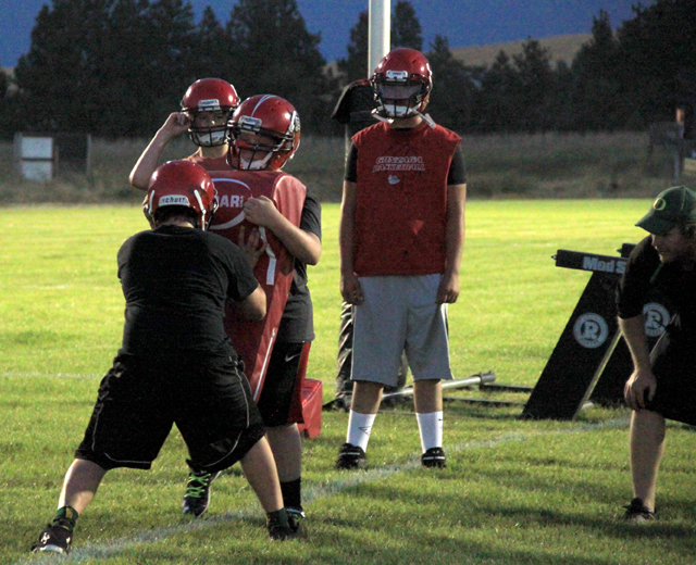 Prairie football practice started Monday and assistant coach Matt Elven, right, is shown working with the lineman. The lines are the one question mark on this year’s team as those were the positions hit hardest by graduation.