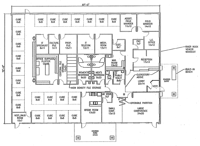 The floor plan of the new BLM office building. Again north is toward the top of the page. The right hand side is the main entrance. Employees will lose considerably in space going from fairly large offices in the former houses to 8x8 cubicles |