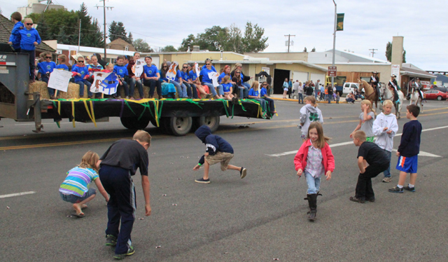 The Cottonwood Saddliers parade entry as well as youngsters chasing after the candy they tossed out.