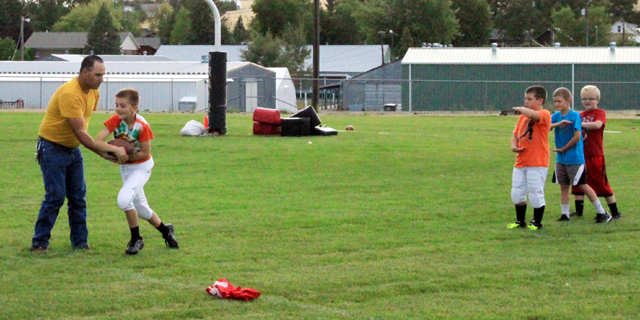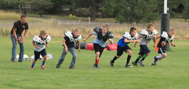David Shears teaches the Peewee football runners how