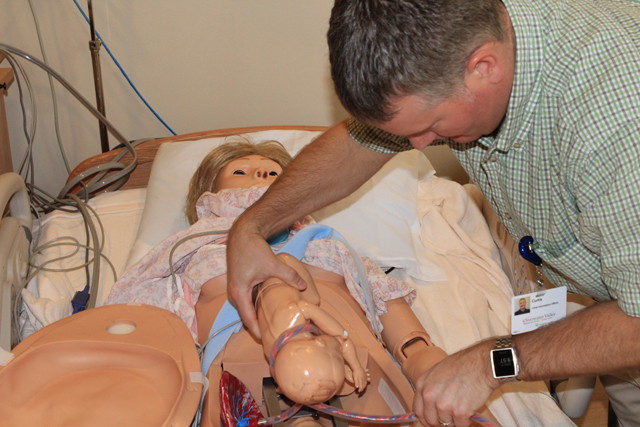 Curtis Fryer, IT Director for both CVHC and SMH places ‘the baby’ back in the ‘simulation mom’ Photos by Cheri Holthaus. |