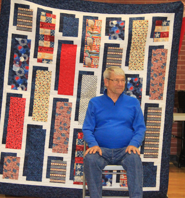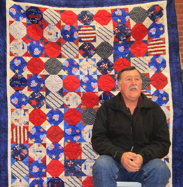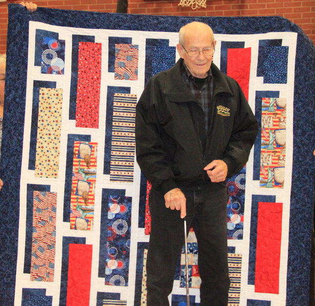 Hank Dasenbrock with his Quilt of Valor. The Quilts below were made by Millie Wimer's sewing