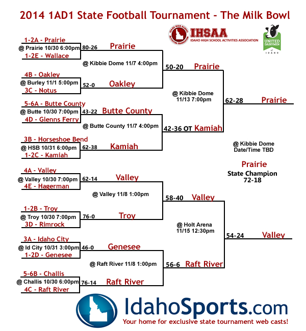 The final, filled in state bracket. PIRATES BOYS FOOTBALL SCHEDULE FOR 2014 SEPTEMBER 5-Genesee*, there, won 60-20 12-Salmon River, there, 7 p.m. MDT (6 p.m. our time), won 60-6 19-Council, there, 7 p.m. MDT (6 p.m. our time), won 60-8 26-C.V.*, Homecoming, here, won 64-8 OCTOBER 3-Lapwai*, there, won 60-16 10-Troy*, here, won 64-8, clinch playoff berth 17-Potlatch*, there, won 72-18, clinch tie for league title 24-Kamiah*, here, won 48-6 30-State Playoff vs. Wallace at Cottonwood, won 80-26 NOVEMBER 7-State Playoff vs. Oakley at Kibbie Dome, won 50-20 13-State Playoff vs. Kamiah, Kibbie Dome, 7 p.m., won 62-28 21-State Championship, Kibbie Dome, 6 p.m., vs. Valley, won 72-18, State Champions!! *League Game PRAIRIE JUNIOR HIGH SCHOOL BOY’S BASKETBALL 2014-2015 December 4-Grangeville, Away, 4:00 9-Highland, Home, 4:00 11-Timberline, Home, 4:00 18-SPPS/Summit, Away, 4:00 PIRATES BOYS BASKETBALL SCHEDULE FOR 2014-15 *indicates league game DECEMBER 9-Moscow, there, 5:30 p.m. 10-JV vs Grangeville, here, 7:30 p.m. 12-Grangeville, there, Idaho County Shootout, V only, 7:30 p.m. 16-Troy, there* 18-Kamiah, here* 19-Genesee, there* 29-30-31-NIC Tourn. at Cd’A, TBA JANUARY 6-Lapwai, here* 9-C.V., there* 15-Potlatch, here*, 5 p.m. 20-Genesee, here* 23-Kamiah, there* 26-Asotin, here, quad, JV 4:30, V, 6:30 27-Grangeville, here 29-Troy, here* FEBRUARY 5-Lapwai, there* 7-C.V., here*, 1 p.m. 11-Moscow, there, 5:30 p.m. 14-Potlatch, there*, 1 p.m. 17, 18, 19, 23, 24 & 27-District at LCSC 26-State Play-In #1 at Wallace 28-State Play-In #2 at Cascade March 5-7-State at Caldwell Below is the Academic Bowl Schedule for Prairie for the 2014-15 school year. High School 6:30-8:30 p.m. Nov. 10-at C.V. Dec. 1-at Summit Jan. 5 or 12-at Grangeville February-Tournaments March 9-at Prairie April 13-at Timberline Junior High 6:15 to 7:45 p.m. Nov. 17-at Grangeville March 17-at Grangeville April 21-at Nezperce |