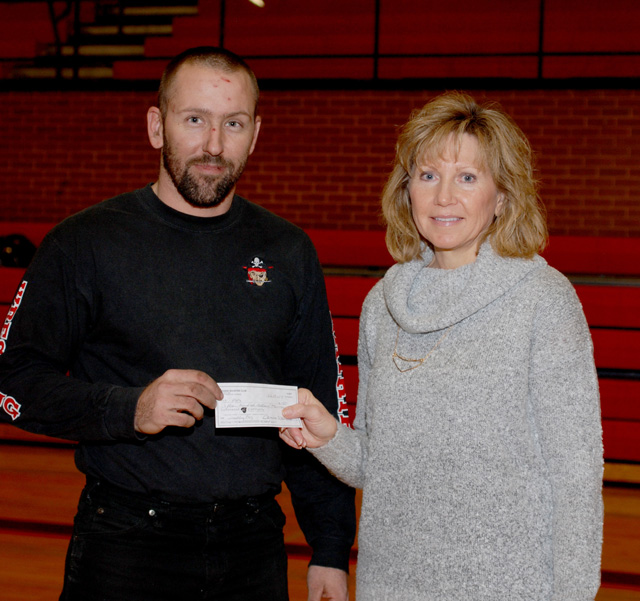 presents Pat McWilliams, Wrestling coach, with a $1,500 check from the