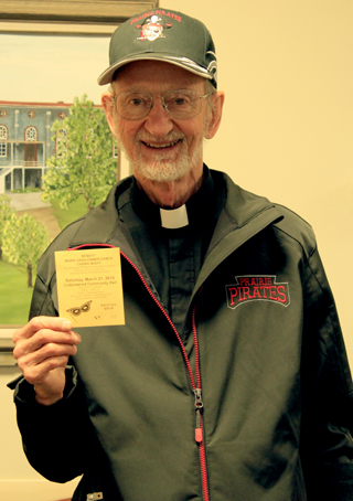Fr Meinrad proudly shows off his Mardi Gras ticket;