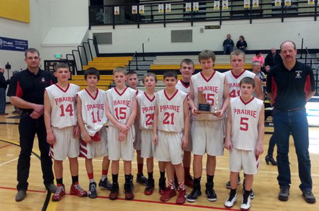 Prairie’s Teel Bruner and Summit’s Ron Frei were named recently as the White Pine League Boys Basketball Coaches of the Year. Bruner for Division 1 and Frei for Division 2. Prairie’s Rhett Schlader and Jake Bruner were named as co-players of the year in Division 1 and were also named first team all-league. Lucas Arnzen was named second team all-league. For Summit Patrick Chmelik and Josh Lustig were named first team all-league in Division 2 while Tyler Krogh was named to the second team. Hallissey boys take 2nd, receive Sportsmanship Trophy When the boys headed to Boise on February 13th for this year's annual Hallissey Tournament, they knew they would