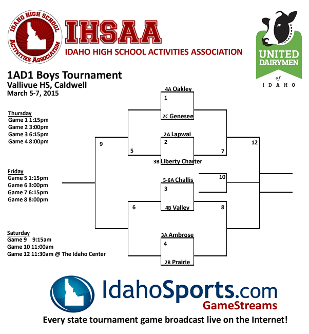 The Prairie Pirates and the Summit Patriots will both be competing at the Real Dairy Shootout State Basketball Tournaments this weekend in Caldwell and Nampa. The Pirates, as the second place team from District 2 in the 1-A Div. 1 bracket will face District 3 champion Ambrose of Meridian at 8 p.m. MST Thursday, March 5 at Vallivue High School in Caldwell, the same place they played last year. In the other game in their half of the bracket at 6:15 p.m. MSTwill be District 5-6 champion Challis and District 4 runner-up Valley. In the other half of the bracket Genesee will play District 4 champion Oakley at 1:15 p.m. MST followed by Lapwai and District 3 runner-up Liberty Charter at 3 p.m. MST. The Patriots didn’t get any favors in the matchups as District 2 champions as they face perennial contender and District 4 champion Carey in the first round at 8 p.m. MST at Caldwell High School. In the other game in their half of the bracket are Logos and District 5-6 champion Mackay at 6:15 p.m. MST. There is a good chance of a Summit-Logos rematch in the second round. In the other half of the bracket are District 1 champion Lakeside and District 4 runner-up Dietrich at 1:15 p.m. MST and District 3 champion Council against District 5-6 runner-up Rockland at 3 p.m. MST. The brackets are shown below.