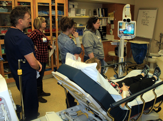 RNs at St. Mary’s Hospital receive stroke training through the telehealth program; Dan Meyers, Tracy Williams, Peggy Goeckner, Diane Roberts and Michelle Kehler the ’patient’ on the stretcher. Photo provided by Cheri Holthaus. |