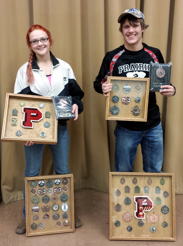The Prairie wrestling team had their awards night recently. Shown are Kellie Heitman was most improved and Dally Ratcliff was team captain. Both are seniors and are shown with shadow boxes with their medals that were made by Steve Lamont. Photo by Jennifer Heitman. Pirates beat Highland 12-1 Daniel Mager had an outstanding outing on the mound as the southpaw tossed a 1-hitter with 15 strikeouts as Prairie beat Highland 12-1 at Airport Park in Lewiston Thursday, March 26. The game was originally to be played at Clearwater Park but the field was too wet and it was moved to Airport Park. Prairie tallied 2 runs each in the third and fifth innings and led just 4-0 going into the top of the 7th. Prairie erupted for 8 runs in the 7th and Highland answered with their only run of the game off of Mager. Prairie had 9 hits led by Calvin Hinkelman who had 2 doubles and a single. Jake Bruner had a pair of singles. John Mager had a triple and Jace Perrin, Terran Peery and Devin Bruegeman each had a single. Prairie goes into Spring Break with a 2-1 record, 2-0 in league play. Prairie 0 0 2 0 2 0 8—12 9 2 Highland 0 0 0 0 0 0 1— 1 1 2