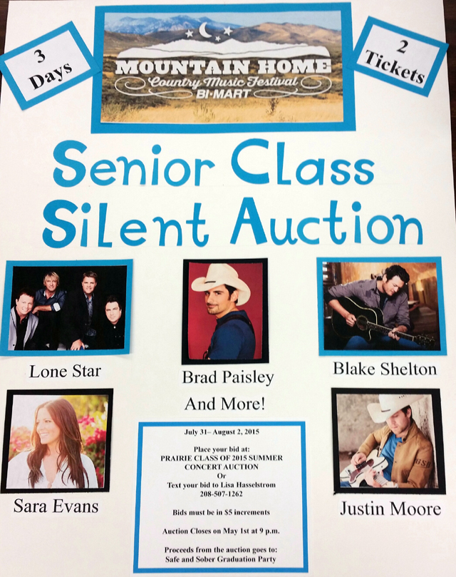 WHAT? 2 tickets - Mountain Home Country Music Festival WHO? Brad Paisley, Lone Star, Sara Evans, Blake Shelton, Justin Moore, Florida Georgia Line & MORE!!! Over 20 Artists!!! WHEN? July 31- August 2, 2015 WHERE? Foothills of the Sawtooth Mountatins ( 30 min from Mountain Home, Idaho) HOW???? Place Your Bid On FACEBOOK Search for....PRAIRIE CLASS OF 2015 SUMMER CONCERT AUCTION **If you wish to bid, but DO NOT have a Facebook account, you may text or call 208-507-1262 to place your bid,.. and your bid will be added to the Facebook Page** Please indicate who you are in the text.*Bids are to be made in $5 increments please* As of 3/31/15 the bid sits at $210/////// each ticket has a face value of $175 Proceeds go to the..... "Safe & Sober Class of 2015 Graduation Party" Bidding Ends MAY 1, 2015 @ 9:00pm http://mountainhomefestival.com/ ![]() |