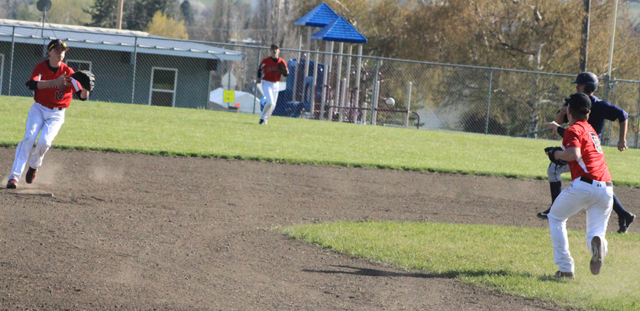 Shortstop Devin Bruegeman tosses the ball to second baseman Nick Mager for a forceout in the Genesee game. In the background is rightfielder Jace Perrin.
