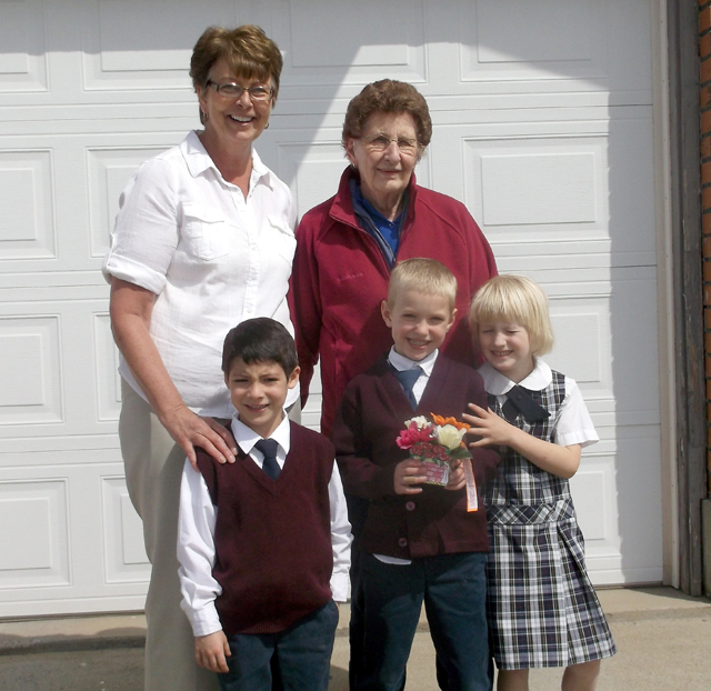 The Kindergarten students at Summit Academy along with their teacher, Mrs. Rehder delivered May baskets of flowers to people around town on May 1st. Shown is the class delivering a basket to Audrey Uhlenkott. Photo provided by Summit Academy. |