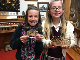 Sydney Krogh and Makayla Rose with royal crowns from Europe at the Historical Museum.