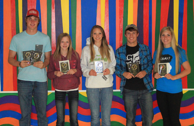 Prairie High School track awards were given out Tuesday, May 21. From left are Lucas Arnzen, boys runner of the year and high point winner; Laney Uhlenkott, girls “Pirate” award; Mykaela McWilliams, girls high point winner; Dally Ratcliff, boys “Pirate” award and Chaye Uptmor, girls runner of the year. |