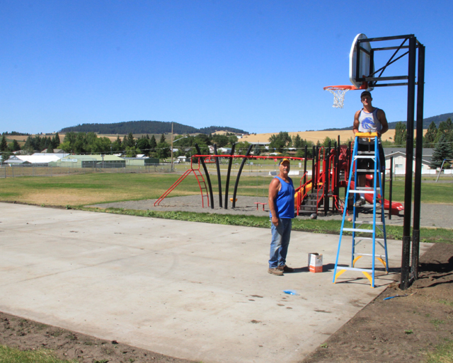 mounting the hoops on the new outdoor basketball court at Prairie Elementary.