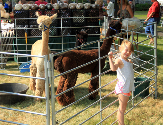 Mark and Stacie Anderson’s daughter poses with the alpacas at the Raspberry Festival.
