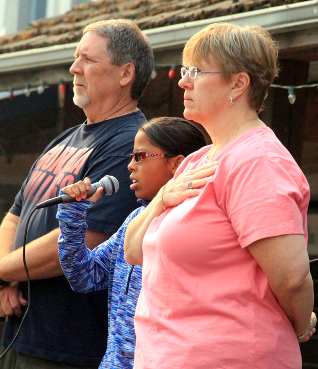 Trinity Martinez, who won the Two-Minute Talent Show in her age group the night before, sang the National Anthem to officially start the Parade. She is between announcer Pat Holthaus and his helper Shari Daly. |