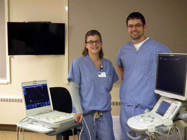 Dione Severns and Cody Wilkinson showing off the echocardiogram and ultrasound machines; in the background is the new TV. |