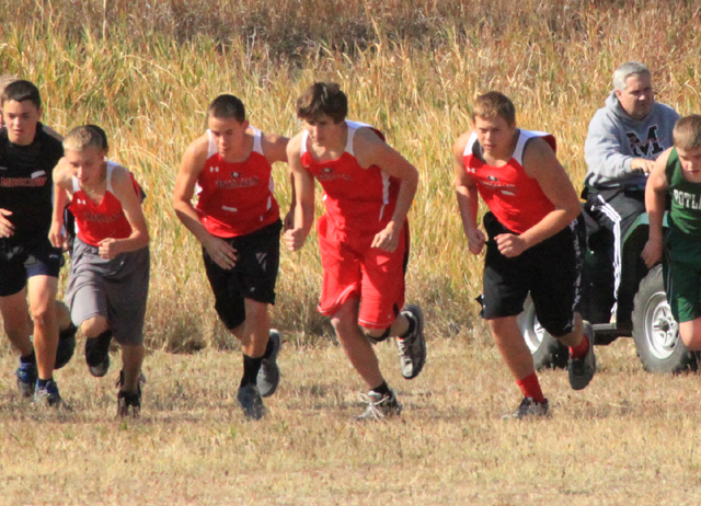 The start of the JV boys race. From left for Prairie are James Villamoor, Grant Gehring, Anthony Karel and Ryan Glimp.