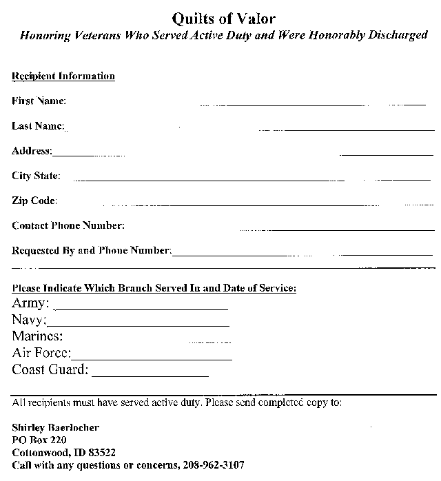 Here it is already the middle of October. Where does the time go? The Camas Prairie Quilt of Valor ladies have been very busy making quilts to honor our local veterans. In May 2015, we presented 18 quilts to service men. We are proud to say that we will be presenting 20 quilts on November 11, at the elementary. They have a special program ready to also honor those men and women who served their country. They served the country leaving home, wives, husbands, parents and children. This is the least we can do to show our appreciation for their service. If you have someone in our local area, Cottonwood, Ferdinand, Greencreek and Keuterville and outlying areas who you feel would qualify for a quilt, please fill out the sheet of paper printed below in this newspaper and mail to Shirley Baerlocher. The name and information will be added to our list. We are beginning to work on quilts for the spring presentation on Memorial Day. This takes a lot of material, time and co-ordination on all our parts. If you would be interested in sewing a quilt top or a quilt, donating money for fabric or doing the hand sewing, please contact Shirley Baerlocher 208-962-3107. ![]() |