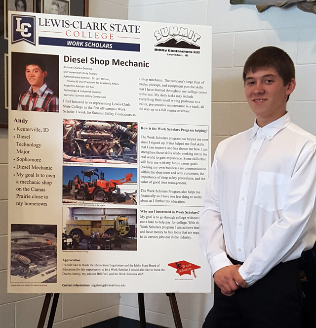 Andy Gehring of Keuterville with his storyboard outlining his Work Scholar program as a diesel shop mechanic.