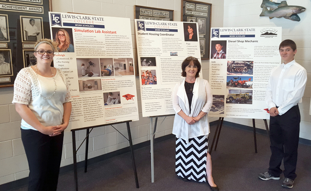 The Lewis-Clark State College Work Scholars Program was featured during the Idaho State Board of Education meeting in Lewiston on Wednesday, October 21, 2015. LCSC Work Scholars, including three from Cottonwood and Keuterville, were among the 11 students featured in a Student Poster Presentation at the meeting where students interacted with Idaho State Board of Education members, administrators from other Idaho colleges and universities, and member of the press. Their presentations examined the work they are doing and how their experiences will help shape their future careers. Ashleigh Bieker and Peggy Sprute, both of Cottonwood and Andy Gehring of Keuterville are all part of LCSC Work Scholars’ inaugural class. Bieker works in the Nursing and Health Sciences Division as the Simulation Lab Assistant. The nursing “sim lab” is an interactive and hands-on training classroom, using mannequins and nursing equipment to simulate the clinical environment. Bieker is in charge of preparing the sim lab and its equipment for nursing students’ training. Sprute works as the Student Housing Coordinator in the International Programs Office where she maintains relationships between community host families and their international student residents. Sprute is also restructuring and streamlining the office’s current record system. Gehring, the first off-campus Work Scholar, works for Summit Utility Contractors, a Lewiston contracting business where he is a diesel mechanic. Gehring’s tasks range from preventative maintenance to full engine replacements. Work Scholars is currently accepting applications for the Spring 2016 Semester. Applications are due October 30, 2015.