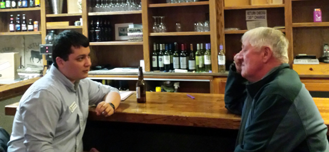 Lewiston City Councilman Jesse Maldonado chats with Dick Adams at the Idaho County Democrats meeting. Photo by Bill Farmer. |