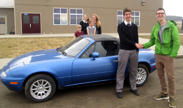 Summit student body president Dean Stubbers with Kyle Kinard of Seattle, who won the Mazda Miata. Photo by Summit Academy. The winner of Summit's car raffle is Kyle Kinard of Seattle Washington. Kyle is a car enthusiast and has big plans for the car, he was very excited to win. He bought a ticket at last summer's Hot August Nights in Lewiston. The car was donated to Summit by Blanche Rockwell of Grangeville. She also won this car in 1994, and gave it as a gift to her husband, Dr. Rockwell, on his 70th birthday. Pictured at right, presenting the car on February 14th, is student body president, Dean Stubbers with Kyle on the right. Behind the car are students from Summit Academy: Thomas and Makayla Rose, Lauren Stubbers, and Summit Academy Secretary, Amy Rose. Correction In the Summit at Lapwai game writeup in last week's update we had a misunderstanding about the game statistics. Apparently Tyler Krogh missed the game due to illness and Patrick Chmelik played despite being sick, so Summit’s two leading scorers throughout the season did not score at all. Jake Stubbers, normally a sub, replaced Tyler Krogh in the starting lineup and stepped it up and poured in a season high 19 points to lead all scorers. Dylan Krogh scored 8, Caleb Currier 7, Chris Osborne 6 and Dean Stubbers 4. Following is the corrected scoring for Summit: D. Stubbers 1, 2-3, 4; D. Krogh 3, 0-0, 8; J. Stubbers 6, 7-9, 19; Chmelik 0, 0-0, 0; Currier 3, 0-0, 7; Osborne 3, 0-1, 6. 3-pointers-Krogh 2, Currier. SUMMIT BOYS BASKETBALL SCHEDULE FOR 2015-16 2-C.V., there, no JV, 7 p.m., lost 36-56 7-Nezperce, there*, won 52-13 9-Salmon River, here, Prairie Auxiliary Gym, won 54-40 11-Deary, there*, won 45-37 12-Colton, here, Prairie Auxiliary Gym, 2 p.m., won 68-64 in overtime 16-Timberline, there*, postponed due to weather, no makeup date set yet. 9-Logos, at Highland, 3 p.m., won 54-52 14-Deary, here*, Prairie Auxiliary Gym, won 65-50 16-Highland, there*, 4:30 p.m., won 58-38 19-Nezperce, there*, won 67-26 21-Kendrick here*, won 57-50 26-Kendrick, there*, won 50-49 27-at Timberline, makeup game for Dec. 16, won 61-58 30-Highland, home game at Highland, 4:30 p.m.*, won 65-40 6-Logos, there*, won 53-43 8-home game at Timberline, makeup of Jan. 23 postponement, won 46-40 24-26-District at LCSC, Summit to play at 7 p.m. Wednesday, Feb. 24 against an opponent to be determined by games of Feb. 22. *League game |