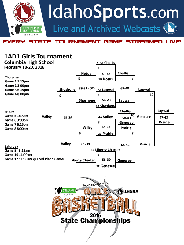 In the second quarter Lustig came off the bench and seemed to provide the spark the Pirates needed. She scored twice on putbacks and fed Uptmor for another basket as Prairie tied the score within the first 2 minutes. Wemhoff scored on an inbound feed from Danly to put Prairie ahead and Danly capped off a 10-0 run with a jumper from 16 feet. Genesee answered with a 0-6 run of their own to retake the lead. A wraparound pass from Danly to Lustig for a lay-up tied it. Genesee scored a free throw to retake the lead but VonBargen answered with a pair of free throws that gave Prairie the lead for good. Wemhoff followed with a steal and drive for a lay-up. After a Genesee basket Tidwell scored on a putback, Danly added 2 free throws and another steal by Wemhoff led to a free throw for a 27-21 lead. Genesee scored to break the run but Uptmor scored to give Prairie a 29-23 halftime lead. The third quarter belonged to VonBargen who dominated inside. In just the third quarter she connected on 5 of 6 shots and 3 of 4 free throws to help Prairie outscore Genesee 21-15 and take a 13 point lead into the fourth quarter. She had a pair of putbacks, a couple of up and under moves and a left handed shot for her 5 baskets. Fellow post Lustig was 2 for 3 from the field and Uptmor was 4 for 4 at the line. Ranisate hit a pair of 3-pointers for Genesee to help keep them in the game. The fourth quarter was all about free throws for the Pirates as they went to the line 21 times, making just 9 but that was enough to help hold off the Bulldogs and send the Pirates to a rematch with Lapwai in the championship game. VonBargen wound up with 20 points to led the scoring with Uptmor adding 13 and Lustig 11. Wemhoff scored 9, Danly 6, Tidwell 4 and Josie Peery 1. Genesee had a 35-38 edge on the boards. VonBargen and Danly each had 9 to lead the Pirates. Wemhoff had 8 steals and Danly and Tidwell had 3 assists each. Prairie was 20 for 50 from the field, 40%, and 24 for 41 at the line, 59%. Genesee was 21 for 57 from the field, 37%, and 4 for 6 at the line, 67%. Prairie 6 23 22 13 -64 Genesee 12 11 15 14 -52 Prairie-Tidwell 1-10, 2-4, 4; Wemhoff 3-10, 3-9, 9; VonBargen 7-10, 6-8, 20; Uptmor 3-6, 7-10, 13; Danly 1-4, 4-6, 6; Lustig 5-8, 1-2, 11; Peery 0-1, 1-2, 1. 3-pointers-none. Genesee-Ranisate 6-16, 2-2, 17; Cornell 1-6, 0-0, 5; C. Mayer 6-8, 0-0, 13; Druffel 2-10, 0-0, 4; Burt 3-9, 2-4, 8; Prindle 0-2, 0-0, 0; O’Connell 1-5, 0-0, 2; B. Mayer 1-1, 0-0, 3. 3-pointers-Ranisate 3, C. Mayer, B. Mayer, Cornell. held