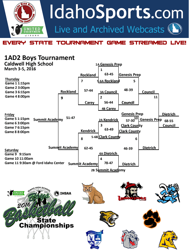 The final state bracket SUMMIT BOYS BASKETBALL SCHEDULE FOR 2015-16 2-C.V., there, no JV, 7 p.m., lost 36-56 7-Nezperce, there*, won 52-13 9-Salmon River, here, Prairie Auxiliary Gym, won 54-40 11-Deary, there*, won 45-37 12-Colton, here, Prairie Auxiliary Gym, 2 p.m., won 68-64 in overtime 16-Timberline, there*, postponed due to weather, no makeup date set yet. 9-Logos, at Highland, 3 p.m., won 54-52 14-Deary, here*, Prairie Auxiliary Gym, won 65-50 16-Highland, there*, 4:30 p.m., won 58-38 19-Nezperce, there*, won 67-26 21-Kendrick here*, won 57-50 26-Kendrick, there*, won 50-49 27-at Timberline, makeup game for Dec. 16, won 61-58 30-Highland, home game at Highland, 4:30 p.m.*, won 65-40 6-Logos, there*, won 53-43 8-home game at Timberline, makeup of Jan. 23 postponement, won 46-40 24-26-District at LCSC, Beat Deary 50-37, lost to Kendrick 44-55; beat Logos 58-32 March 3-5-State at Caldwell High School, open against Dietrich at 7 p.m. PST, lost to Dietrich 47-78; beat Kendrick 62-45, beat Rockland 51-47, 4th at State *League game |